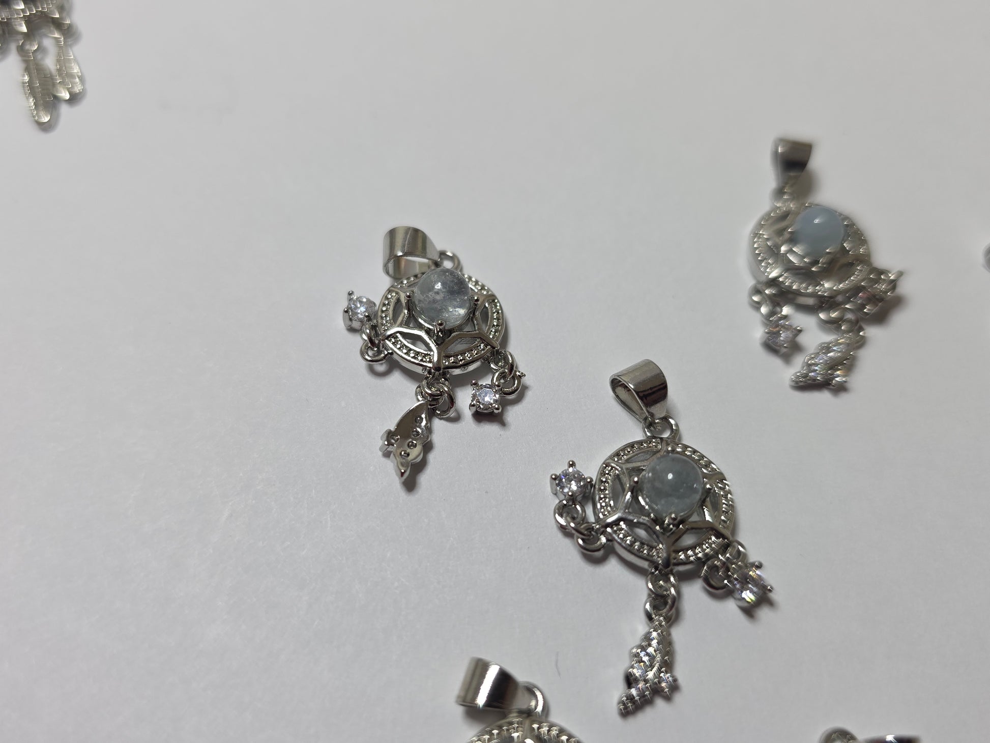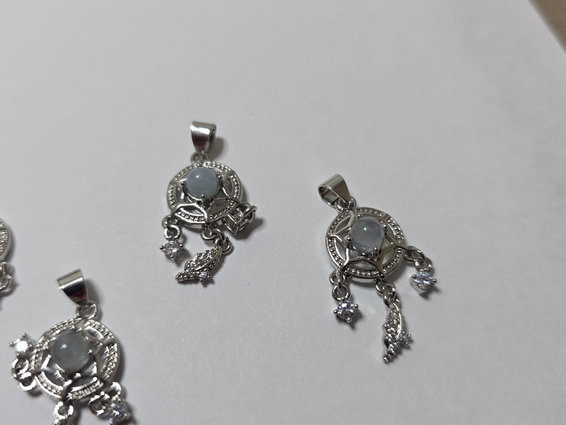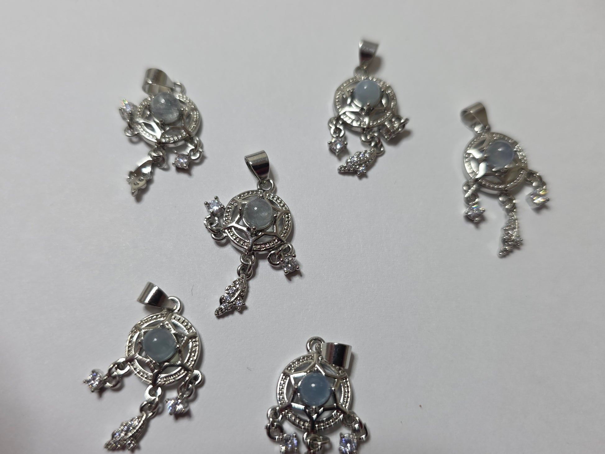 Small blue dream catcher pendant. Not sure of the material. I think they are aquamarine. Comes with a stainless steel chain